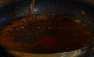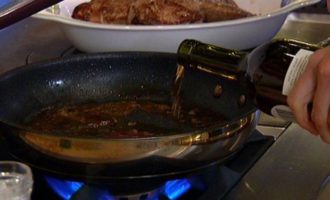 Приготовить соус: в сковороду, где жарилась печень, влить вино и уксус и уварить на треть.