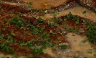 Выложить печень в сковороду с винным соусом, посыпать шалфеем и прогревать 3-5 минут.