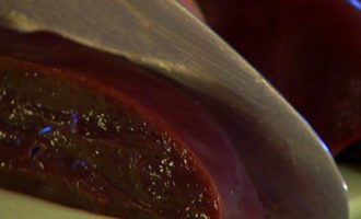 Печень вымыть, обсушить, удалить с нее пленки и толстые прожилки, а затем нарезать толстыми ломтиками.