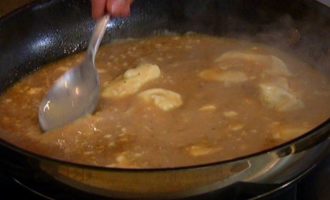Добавить куриный бульон и уварить на сильном огне наполовину.