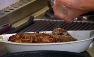 Разогреть в тяжелой сковороде оливковое и сливочное масло и обжаривать печень по 2-3 минуты с каждой стороны. Переложить в отдельную посуду, посолить и поперчить.