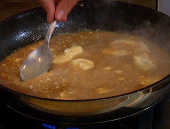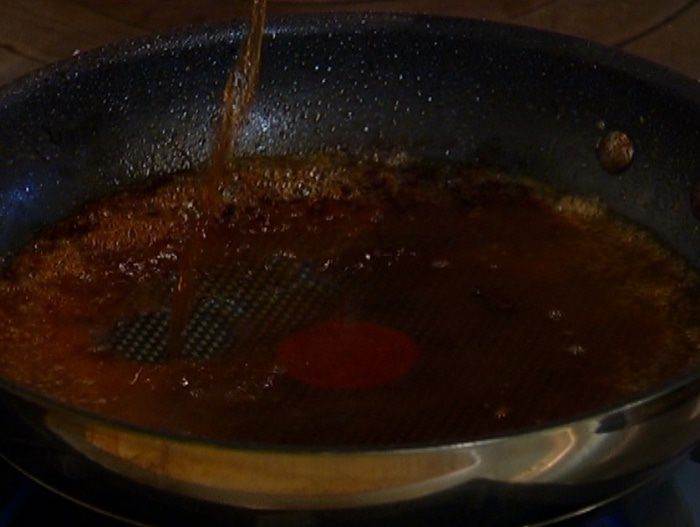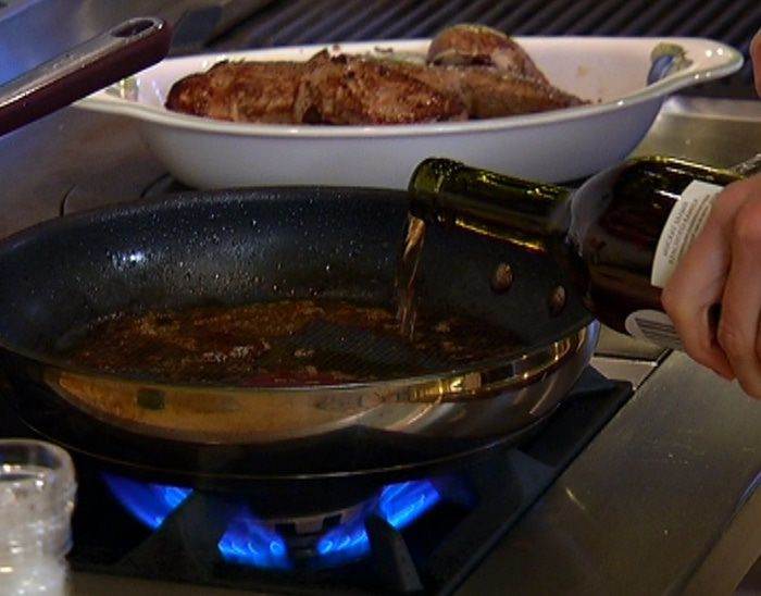 Приготовить соус: в сковороду, где жарилась печень, влить вино и уксус и уварить на треть.