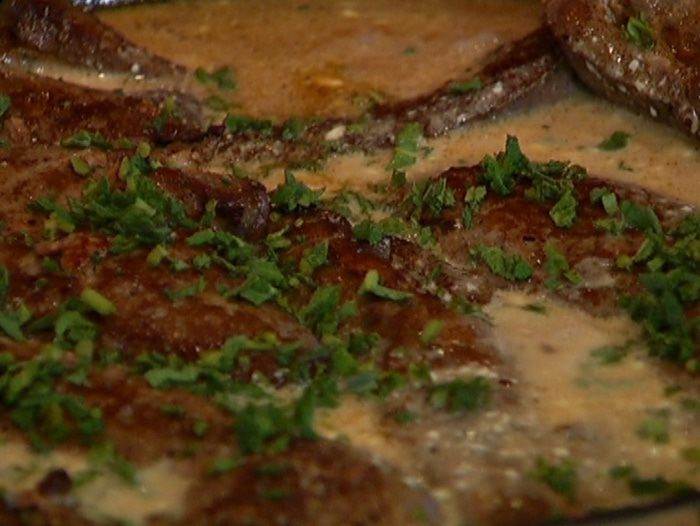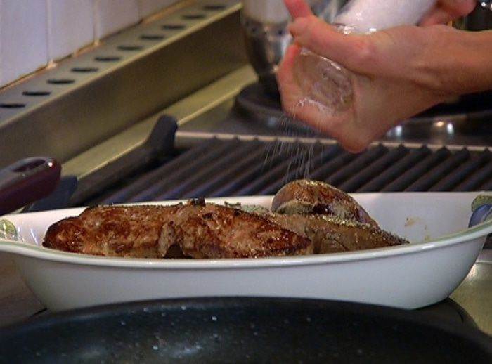 Разогреть в тяжелой сковороде оливковое и сливочное масло и обжаривать печень по 2-3 минуты с каждой стороны. Переложить в отдельную посуду, посолить и поперчить.