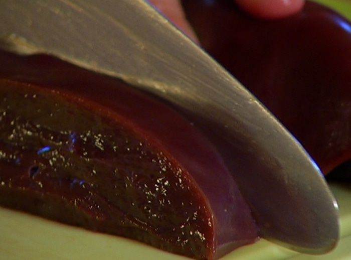 Печень вымыть, обсушить, удалить с нее пленки и толстые прожилки, а затем нарезать толстыми ломтиками.
