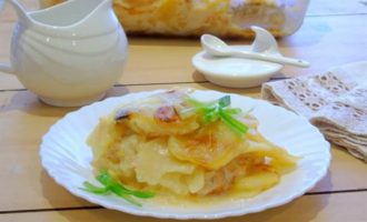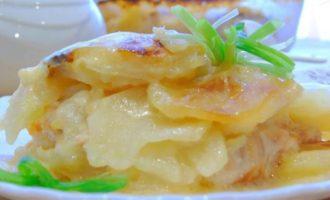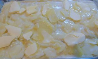 • Выкладываем оставшийся картофель. Молочный соус чуть увариваем на слабом огне минут 5, если же он и так у вас вышел густым, то просто пропускаем этот шаг и заливаем им картофель. Сверху раскладываем кусочки сливочного масла и отправляем в разогретую до 180°C духовку до легкой или не очень легкой, как у меня, румяности.