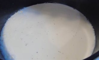 • Смешать в кастрюльке молоко и сливки и поставить на огонь. Туда же отправляем щепотку мускатного ореха. Солим.