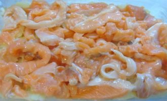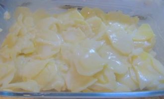 • Форму для запекания смазываем сливочным маслом, шумовкой выкладываем половину картофеля.