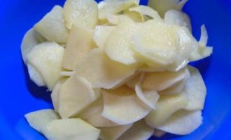 • Картофель очищаем и нарезаем тонкими кружочками, я в этом случае пользуюсь теркой.