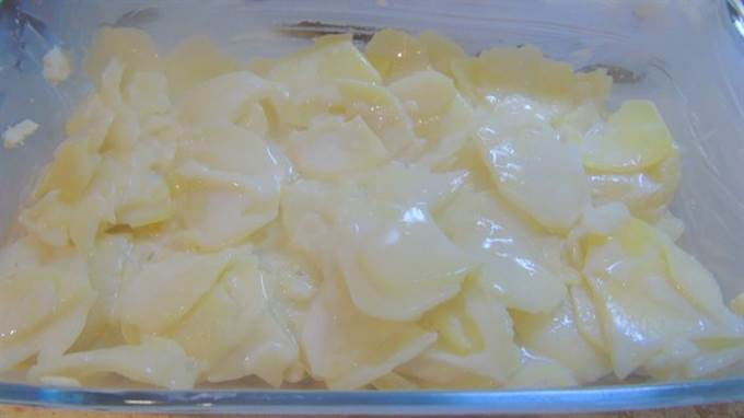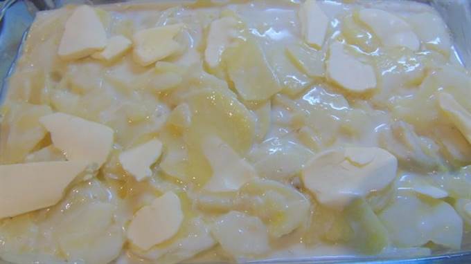 • Выкладываем оставшийся картофель. Молочный соус чуть увариваем на слабом огне минут 5, если же он и так у вас вышел густым, то просто пропускаем этот шаг и заливаем им картофель. Сверху раскладываем кусочки сливочного масла и отправляем в разогретую до 180°C духовку до легкой или не очень легкой, как у меня, румяности.