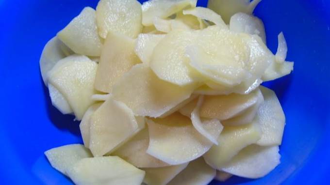 • Картофель очищаем и нарезаем тонкими кружочками, я в этом случае пользуюсь теркой.
