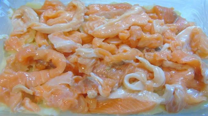• Форму для запекания смазываем сливочным маслом, шумовкой выкладываем половину картофеля.
