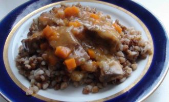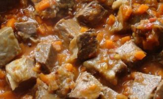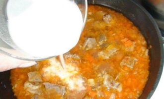 Когда морковь будет готова, муку развести бульоном или водой (на 1 ст. л. муки 50-70 мл. жидкости) и добавить к мясу, помешивая.