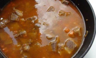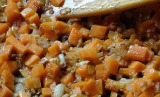 Залить бульоном, сделать минимальный огонь, закрыть крышкой и тушить до готовности моркови (минут 15).
