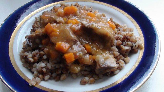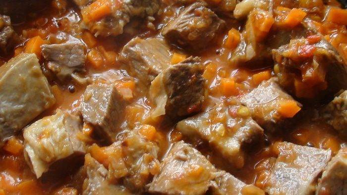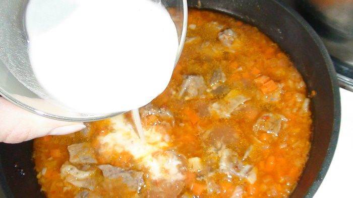 Когда морковь будет готова, муку развести бульоном или водой (на 1 ст. л. муки 50-70 мл. жидкости) и добавить к мясу, помешивая.