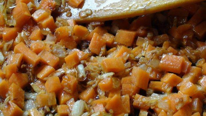Залить бульоном, сделать минимальный огонь, закрыть крышкой и тушить до готовности моркови (минут 15).