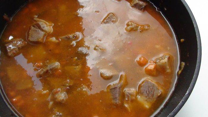 Затем добавить мясо и обжаривать ещё две минуты. -