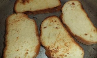 Батон нарезать ломтиками, обжарить ломтики с двух сторон, выложить на блюдо. -