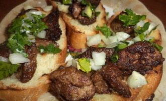На гренки выложить печенку и лук.