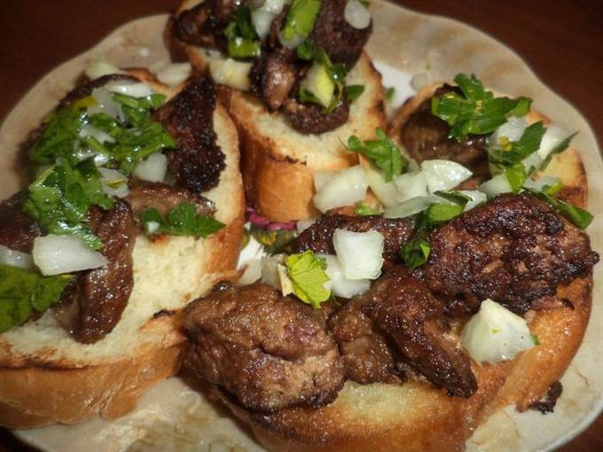 На гренки выложить печенку и лук.