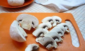 • Грибы моем, чистим и нарезаем дольками среднего размера.