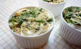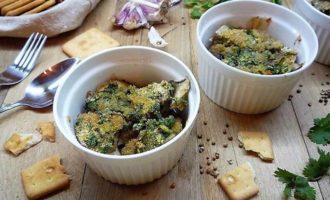 • Получившейся ароматной смесью поливаем грибы, равномерно распределяя зелень. Посыпаем сверху панировочными сухарями. Запекаем в духовке при температуре 180°С 15 — 20 минут.