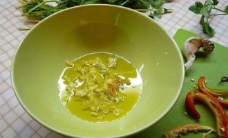 • В отдельной чашке смешиваем раздавленный через пресс чеснок, соль, перец, итальянские травы, мелко резанный перец чили, добавляем оливковое масло и перемешиваем.