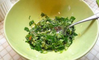 • Добавляем мелко рубленую зелень, еще раз перемешиваем.