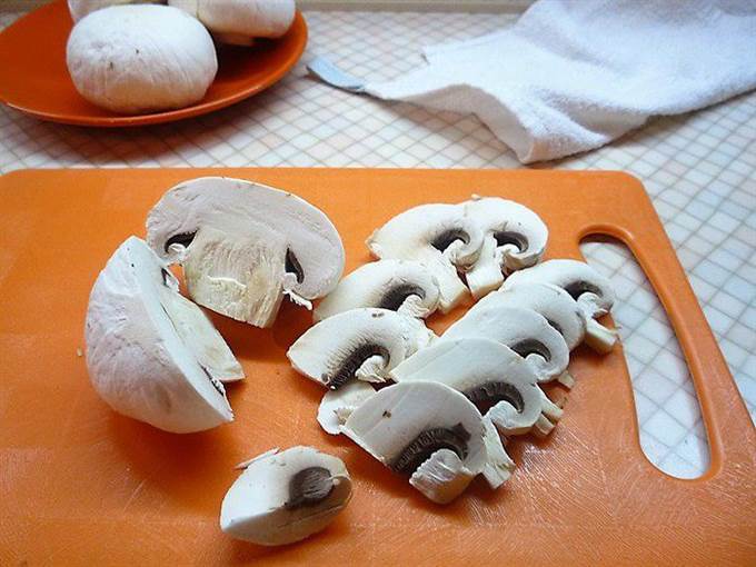 • Грибы моем, чистим и нарезаем дольками среднего размера.