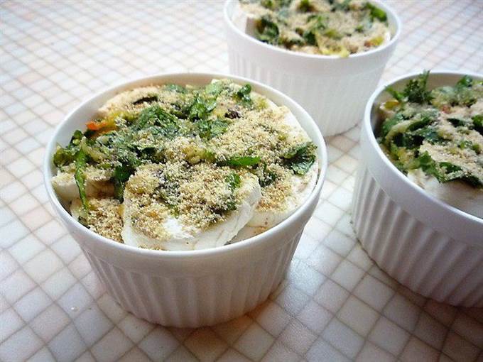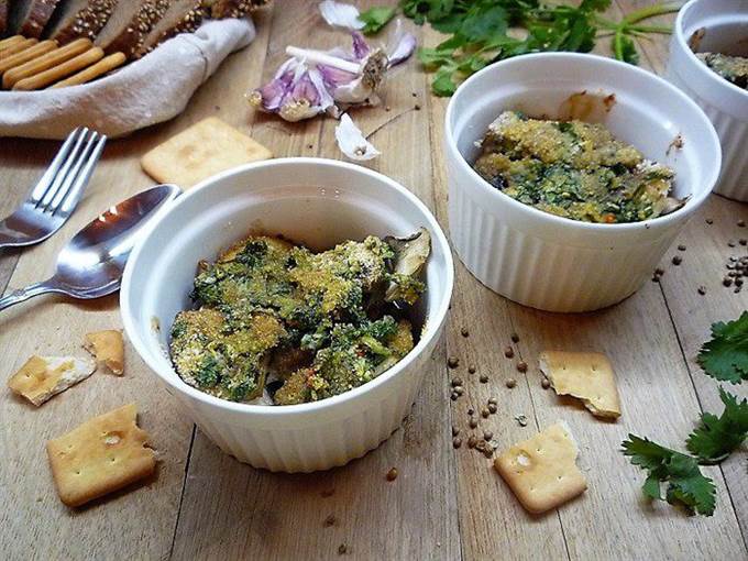 • Получившейся ароматной смесью поливаем грибы, равномерно распределяя зелень. Посыпаем сверху панировочными сухарями. Запекаем в духовке при температуре 180°С 15 — 20 минут.