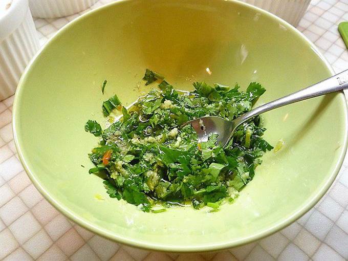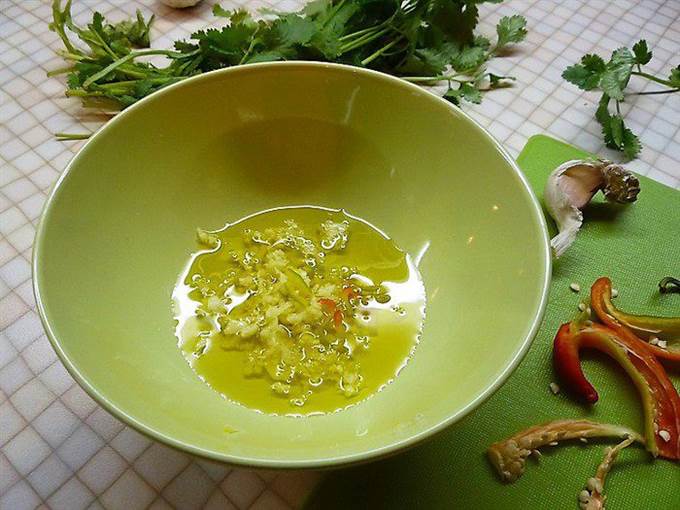 • В отдельной чашке смешиваем раздавленный через пресс чеснок, соль, перец, итальянские травы, мелко резанный перец чили, добавляем оливковое масло и перемешиваем.