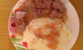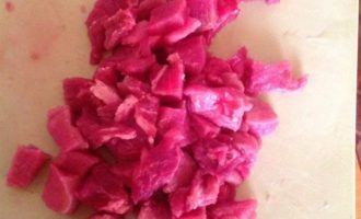 В кастрюлю влить растительное масло, выложить мясу. Обжаривать, изредко помешивая, 5-7 минут.