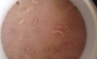 В кастрюлю с мясом добавить ранее обжаренный лук. Добавить соль, залить водой.