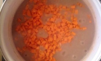 Очистить моркови и порезать кубиками. Добавить морковь в кастрюлю, перемешать, убавить огонь, накрыть крышкой и оставить тушиться 50-60 минут. В процессе тушения подливать воду.