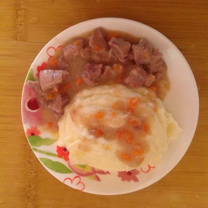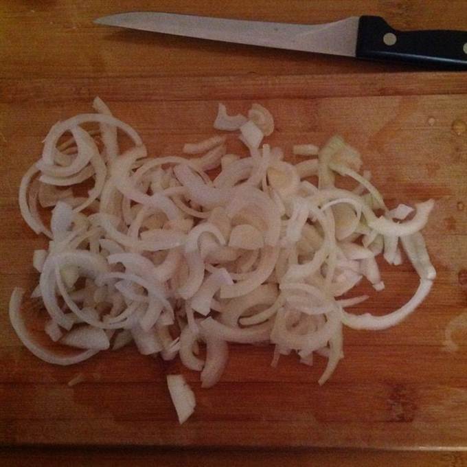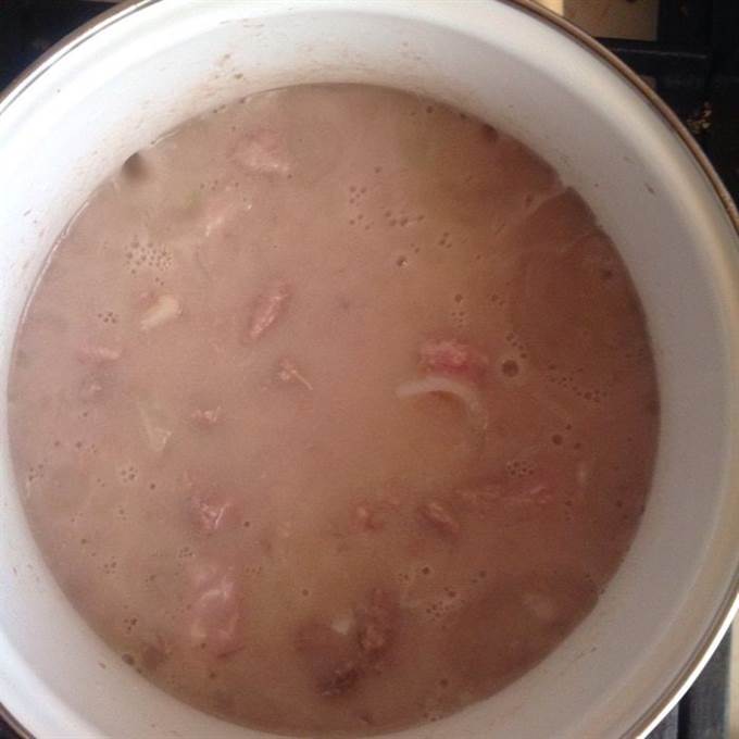 В кастрюлю с мясом добавить ранее обжаренный лук. Добавить соль, залить водой.