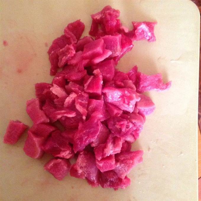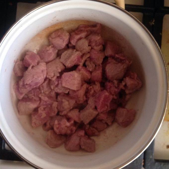 В кастрюлю влить растительное масло, выложить мясу. Обжаривать, изредко помешивая, 5-7 минут.