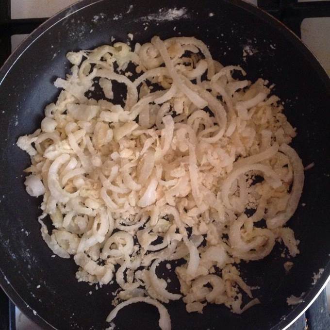 На сковороде разогреть 2 столовые ложки растительного масла, выложить лук и обжаривать, помешивая, 4-5 минут. Затем добавить 3 столовые ложки муки, перемешать и обжаривать еще 2-3 минуты