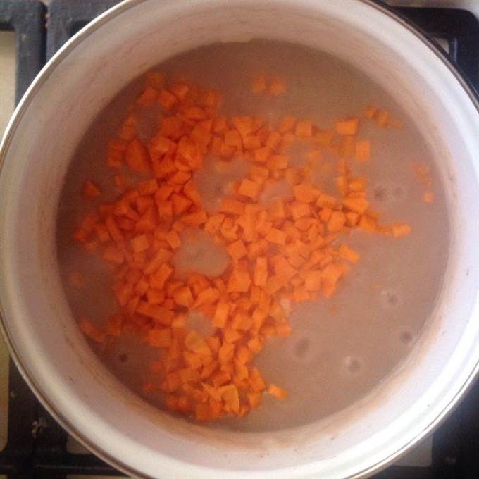 Очистить моркови и порезать кубиками. Добавить морковь в кастрюлю, перемешать, убавить огонь, накрыть крышкой и оставить тушиться 50-60 минут. В процессе тушения подливать воду.