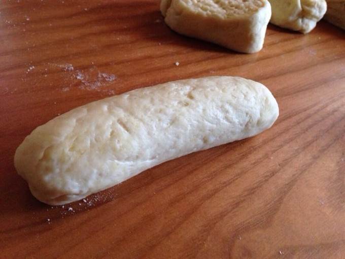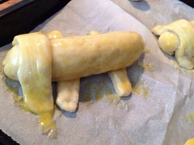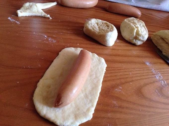 Раскатать одну часть, сверху на тесто положить сосиску. -