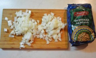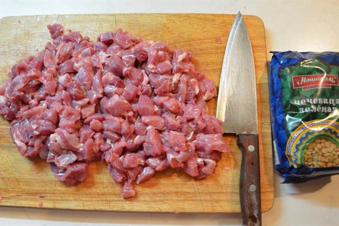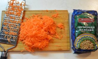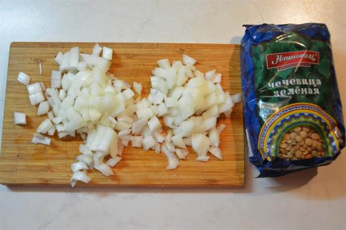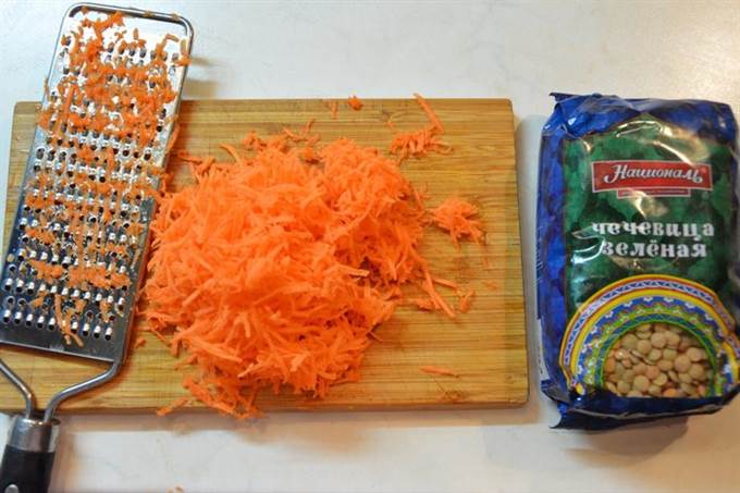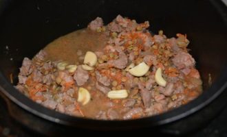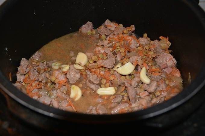 Выключить режим «Жарка». Добавить зеленую чечевицу ТМ «Националь», морковь, чеснок, толченые в ступке специи (кориандр, перец), сушеный чеснок и перемешать. Влить 380 мл кипяченой воды или куриного бульона. Готовить в режиме «Тушение» 40 минут.