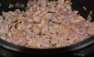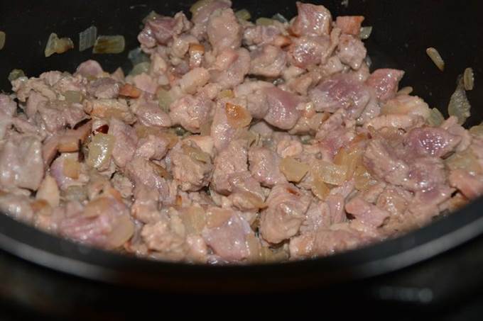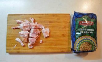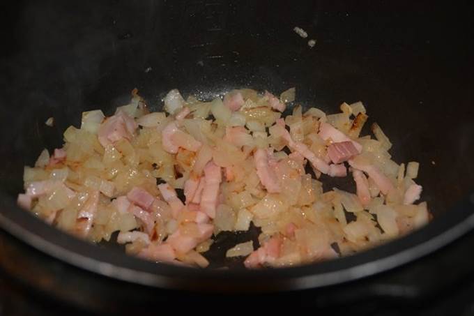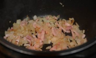 Обжарить лук до золотистого цвета на растительном масле в режиме «Жарка», добавить бекон. Жарить 2 минуты. Посолить.