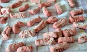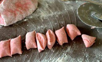Нарезать… Сформировать ньокки, проведя по ним (по желанию) вилкой. На ньокках образуются характерные бороздки (итальянские бабушки используют для этих целей специальную деревянную дощечку с такими бороздками…), которые лучше помогаю цеплять на себя соус в конечном блюде.