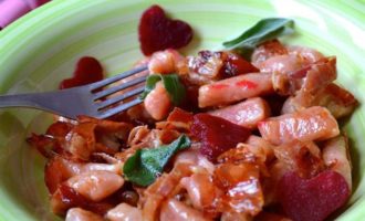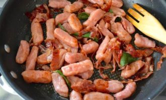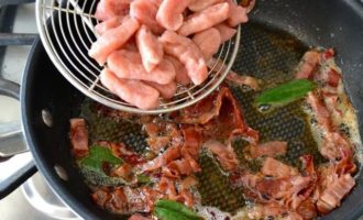 К грудинке в сковороду добавить листья шалфея и сразу же выложить готовые ньокки.