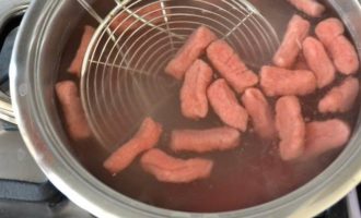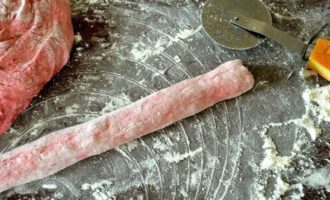 После этого рабочую поверхность обильно присыпать мукой. От теста отделять кусочки и раскатывать их в «колбаску».