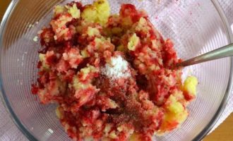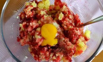 Посолить, поперчить по вкусу и добавить мускатный орех. Смешать со свекольным пюре.