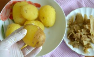 Картофель отварить «в мундире» (с кожурой) до готовности. Слить воду и очистить его от кожуры еще горячим! Осторожно! Можно для этих целей наколоть картофелину на вилку и другой рукой быстро снять с нее кожуру. Я использую перчатки — тоже горячо, но терпимо, если быстро чистить!