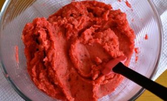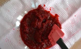 Свеклу необходимо заранее отварить или запечь. Необходимое указанное количество уже очищенной свеклы измельчить до состояния пюре с помощью блендера или погружным миксером. В случае необходимости можно добавить немного воды от варки свеклы для получения более гладкой консистенции свекольного пюре.