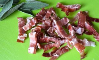 Кастрюлю с водой поставить на огонь. Пока закипает вода, подготовить и нарезать на полоски грудинку. Вымыть и подготовить листья шалфея.