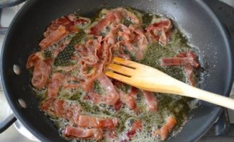 В сковороде разогреть сливочное масло и обжарить в нем слегка грудинку.