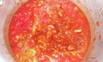 В оставшуюся половину добавить томатную пасту, немного обжарить, добавить консервированные в собственном соку, нарезанные кусочками томаты и оставить тушиться на маленьком огне не закрывая крышкой.соус должен быть густой!в конце соус посолить, поперчить, добавить сахар и сухой тимьян.