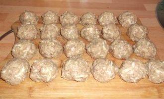 В это время в фарш добавляем обжаренные лук и чеснок, натёртый пармезан, панировочные сухари, яйцо, мелко порезанные петрушку и тимьян, соль, перец, хорошо перемешиваем и формуем шарики размером с грецкий орех.